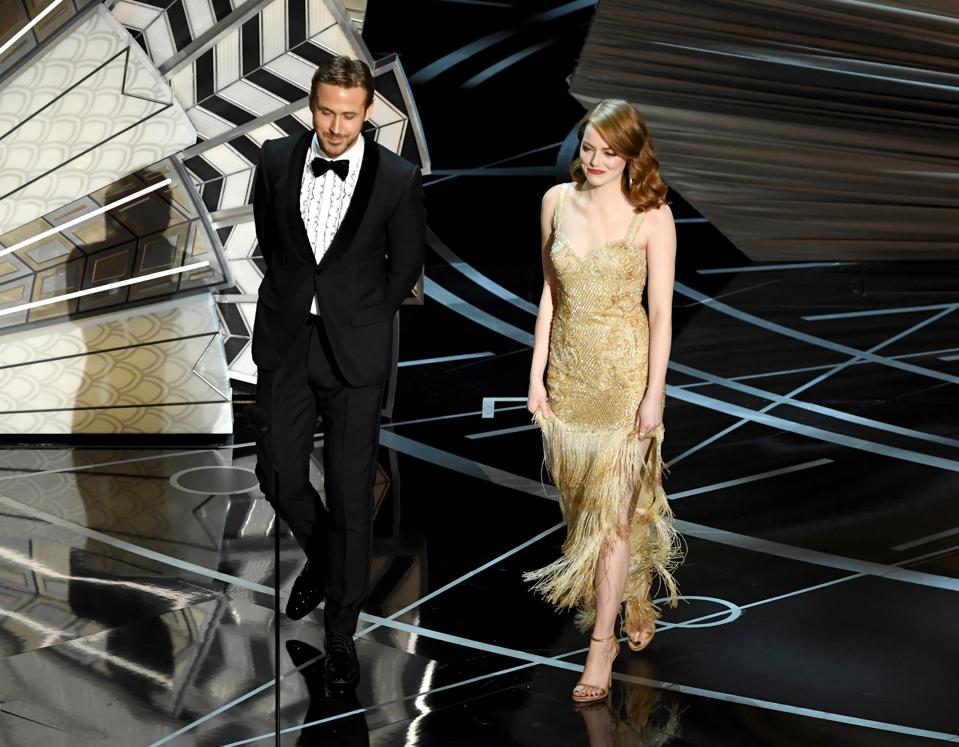 Actors Ryan Gosling and Emma Stone walk onstage during the 89th Annual Academy Awards. (Credit: Kevin Winter/Getty Images)