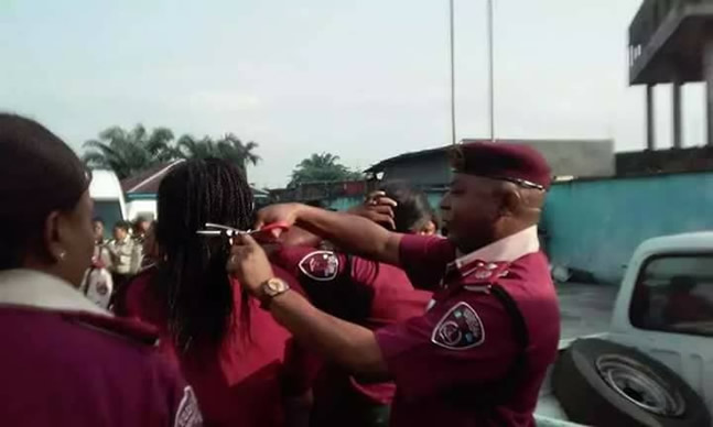 The photos, which started trending late Monday evening, show a man identified as the sector commander of the Rivers State Command of the FRSC, Andrew A. Kumapayi, using a pair of scissors to cut up the hair of some female officials.